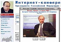 ![]() An image taken from the Internet page of the Russian Internet newspaper 'Strana.ru' displays the on-line press conference of Russian President Vladimir Putin 06 March 2001. Putin went on-line 06 March 2001 with an hour-long question and answer webcast, though the questions had been chosen from a list submitted in advance. Netsurfers can log on to the Q-and-A session from 1500 GMT at two Russian sites, www.gazeta.ru and www.strana.ru, and at the BBC site www.bbc.co.uk/talkingpoint, and see and hear the Russian president choose from among some 10,000 queries. Copyright AFP Photos 2001 |
