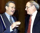 ![]() US Defense Secretary Donald Rumsfeld (L) speaks with Senator Carl Levin, D-MI. Levin is expected to become chairman of the Senate Armed Services Committee following Senator Jim Jeffords' defection from the Republican Party last Thursday. AFP Photo by Tim Sloan |