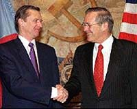 ![]() Russian Defense Minister Sergei Ivanov (L) shakes hands with US Defense Secretary Donald Rumsfeld after their meeting in Moscow 03 November 2001. Rumsfeld and Ivanov met one on one in Moscow to discuss nuclear arsenal cuts, US plans for a missile defense system, and US Russian cooperation in the anti-terrorist campaign. AFP Photo |