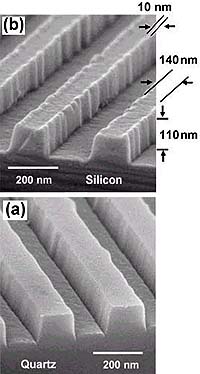 ![]() Image A shows a quartz template used to press ultrasmall patterns into silicon. Image B shows the pattern as it appears in silicon. The measurements are in nanometers, billionths of a meter. |