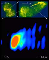 Washington - October 27, 1999 - Astronomers have gained their first glimpse of the mysterious region near a black hole at the heart of a distant galaxy, where a powerful stream of subatomic particles spewing outward at nearly the speed of light is formed into a beam, or jet, that then goes nearly straight for thousands of light-years.The astronomers used radio telescopes in Europe and the U.S., including the National Science Foundation's (NSF) Very Long Baseline Array (VLBA) to make the most detailed images ever of the center of the galaxy M87, some 50 million light-years away. "This is the first time anyone has seen the region in which a cosmic jet is formed into a narrow beam," said Bill Junor of the University of New Mexico, in Albuquerque. Caption Top: Artist's conception of the formation region of M87's jet. Accretion disk (red-yellow) surrounds the black hole, and its magnetic field lines twist tightly to channel the outpouring subatomic particles into a narrow jet. The jet opens widely near the black hole, then is shaped into a narrower beam within a light- year of the black hole. Credit: Space Telescope Science Institute. "We had always speculated that the jet had to be made by some mechanism relatively near the black hole, but as we looked closer and closer to the center, we kept seeing an already-formed beam. That was becoming embarrassing, because we were running out of places to put the formation mechanism that we knew had to be there," said Junor. Junor, along with John Biretta and Mario Livio of the Space Telescope Science Institute, in Baltimore, MD, now have shown that M87's jet is formed within a few tenths of a light-year of the galaxy's core, presumed to be a black hole three billion times more massive than the sun. In the formation region, the jet is seen opening widely, at an angle of about 60 degrees, nearest the black hole, but is squeezed down to only 6 degrees a few light-years away. "The 60-degree angle of the inner part of M87's jet is the widest such angle yet seen in any jet in the universe," said Junor. "We found this by being able to see the jet to within a few hundredths of a light-year of the galaxy's core -- an unprecedented level of detail." The scientists reported their findings in the October 28 issue of the journal Nature. At the center of M87, material being drawn inward by the strong gravitation of the black hole is formed into a rapidly-spinning flat disk, called an accretion disk. The subatomic particles are thought to be pushed outward from the poles of this disk. The scientists believe that magnetic fields in the disk are twisted tightly as the disk spins and then channel the electrically-charged particles into a pair of narrow jets. "Our new image of M87 supports this idea of magnetic fields doing the work of forming the stream of particles into a narrow jet," said Biretta. Jets such as the one in M87 are seen emerging from numerous galaxies throughout the universe. "What we learn about how M87's jet is formed and shaped can be applied to others," said Livio. "These jets coming from radio galaxies and quasars are among the greatest 'particle accelerators' in the universe, but we don't fully understand how they work. This new information will help scientists decipher the physics of these powerful 'engines,'" he added. "We can see such jets very far away, even at distances of billions of light-years," said Junor. "They are fascinating to us because they show how nature is somehow using the accretion disk and the jet to tap into the enormous gravitational energy of a black hole and use that energy to 'light up' the outer regions of the galaxy." "We have never thought these jets are created fully-formed," said Biretta. "They need some space in which to reach the stable configuration we see at larger scales. We now have seen that space for the first time, and this will help show which theoretical models might be right." He added that "magnetic fields are almost certainly involved," and said that future radio-telescope observations will attempt to find evidence of the magnetic fields. The astronomers studied M87 because it is one of the nearest jet- emitting galaxies and its strong radio emission made it an excellent target for radio telescopes. In addition to the VLBA, a continent-wide radio-telescope system, they used the NSF's Very Large Array, a radio telescope near Socorro, NM, and radio telescopes in Germany, Italy, Finland, Sweden and Spain.