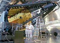 ![]() Team SBL-IFX, a joint-venture comprising TRW, Lockheed Martin and Boeing, is using integrated ground tests of the Alpha high-energy laser, its beam projection telescope and associated beam alignment and correction system to test design concepts for the Space-Based Laser Integrated Flight Experiment (SBL-IFX), an experimental space-based missile defense system proposed by the Air Force and the Ballistic Missile Defense Organization. In the photo, technicians from TRW and Lockheed Martin check the alignment of the primary (gold) and secondary (black "can on quadropod) optics of the beam projection telescope used in recent tests to gather data on how best to measure and maintain the pointing of the SBL-IFX beam director during high-energy lasing events. The telescope is located at TRW's Capistrano Test Site in Southern California in a special vacuum chamber that simulates the space environment. During on-orbit operations, the SBL-IFX beam director will be used to expand, project and focus a high-energy laser beam on a boosting missile target. |