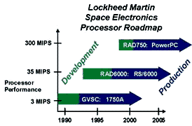Manassas - July 25, 1999 - Lockheed Martin Space Electronics & Communications has licensed the right to develop a radiation hardened version of the PowerPC 750.The RAD750 will be the most powerful radiation hardened microprocessor ever developed, with 10 times the performance of the current generation processors. RAD750 performance is expected to be 250-300 millions of instructions per second (MIPS) over the Mil-Spec temperature range. RAD750 is architecturally and functionally identical as well as pin compatible to the PowerPC 750. A low risk development approach is being used, leveraging the original PowerPC 750 database for design and verification. The RAD750 will be fabricated in a 0.25 micron CMOS process and include proprietary radiation hardened circuit designs. Based on early test site hardware, first pass parts will achieve Single Event Upset (SEU) hardness levels of 1E-11 upsets/bit-day (approx. 1E-5 upsets/processor-day) and Total Dose of greater than 200Krads (Si). Prototype hardware is expected mid-2000, with production availability by year-end.