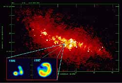 The astronomer's target was the nearby starburst galaxy M82. Starburst galaxies, containing many billions of stars, are disturbed and are undergoing a rapid phase of star creation. Most new stars are quite small and live a long time like our local example, the Sun. But a small number of new stars are huge and evolve very rapidly -- living for only a few million years or so. As Dr. Phil Diamond, director of the MERLIN/VLBI National Facility put it "These giant stars live fast and die young". So, paradoxically, the signature of such star-birth is the explosive death of massive stars. When such large stars die, they do so in spectacular fashion. They blow themselves apart in a titanic explosion called a 'supernova'. The remnants of these supernovae are often expanding shell-like clouds of gas shining brightly in radio waves. Understanding such supernova remnants in regions where stars are being made is particularly important as it is thought that most galaxies, including our own, passed through this phase many billions of years ago when the universe was young. However, the supernova remnants cannot easily be seen in visible light -- even with the Hubble space telescope -- because starburst galaxies contain a lot of obscuring dust. But, as Dr. Tom Muxlow explained, "Radio waves are unaffected by this dust and we are able to look right into the violent centre of the galaxy". The spectacular deaths of the massive stars in the centre of Messier 82, can be used to gain insights into the whole starburst phenomenon. In this galaxy astronomers have seen, for the first time, the detailed evolution of the expanding fireball from a supernova explosion. And these distant and violent events have a strange twist in their tail. Dr. Karen Wills explained; "It is the death-throes of these massive stars which create the heavy elements from which life is made". All the material which makes up the Earth, the rocky planets and moons in our Solar System and indeed, our own bodies, was made in massive stars and scattered by such explosions in the early history of the Milky Way. These latest results will be presented at the December 10th meeting of the Royal Astronomical Society by PhD student, and newest member of the team, Andy McDonald. This project also marks an important technical landmark in VLBI, in that this is the first time that the tape-recorded signals from 20 telescopes across the world have been simultaneously correlated. This was achieved by the the NRAO VLBA correlator facility in Socorro, New Mexico, USA.