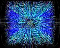 Physicists have created the state of matter thought to have filled the Universe just a few microseconds after the big bang and found it to be different from what they were expecting. Instead of a gas, it is more like a liquid. Understanding why it is a liquid should take physicists a step closer to explaining the earliest moments of our Universe. Not just any old liquid, either. Its collective movement is rather like the way a school of fish swims 'as one' and is a sign that the fluid possesses an extremely low viscosity, making it what physicists call a perfect fluid. In fact, tentative calculations suggest its extraordinarily low viscosity makes it the most perfect fluid ever created. Researchers had confidently believed it would be something like 'steam', consisting of free quarks and gluons. "No one predicted that it would be a liquid," said Professor John Nelson from the University of Birmingham, who heads the British involvement in the STAR Collaboration, a multinational experiment. "This aspect was totally unexpected," said Professor Nelson, "and will lead to new scientific research regarding the properties of matter at extremes of temperature and density, previously inaccessible in a laboratory." The Birmingham contingent is funded entirely by the Engineering and Physical Sciences Research Council (EPSRC). The new state of matter was forged in the Relativistic Heavy Ion Collider (RHIC), situated at the Brookhaven National Laboratory, Long Island, New York. By colliding the central cores of gold atoms together, head-on at almost the speed of light, the researchers created a fleeting, microscopic version of the Universe a few microseconds after the Big Bang. This included achieving a temperature of several million million degrees (about 150,000 times the temperature at the centre of the Sun). They then detected the rush of particles that this miniature 'big bang' created. That was when things started to take an unexpected turn. Instead of the 'every-particle-for-itself, free-for-all' that is expected from a gas, the researchers saw evidence of collective movement as the hot matter, formed at RHIC, flowed out of the collision site. This indicated stronger interactions between the particles than expected, leading to the belief that the quark-gluon plasma is behaving like a liquid. This type of experiment furthers our understanding of what happened in the instants immediately following the Big Bang, leading to a better understanding of the earliest moments of the Universe. However, the unexpected nature of this new state of matter is leaving physicists wondering if the current theoretical models can support these surprising new experimental results. Related Links EPSRC TerraDaily Search TerraDaily Subscribe To TerraDaily Express