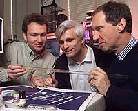 Scientists from Lucent Technologies' Bell Labs have shown that soccer ball-shaped carbon molecules known as bucky balls can act as superconductors at relatively warm temperatures, raising hopes for inexpensive, power loss-free organic electronics and other practical applications such as quantum computers. Superconductors are materials in which the resistance to the flow of electricity vanishes below a certain temperature. The Bell Labs team was able to demonstrate that bucky balls acted as superconductors below 117 Kelvin (minus 249 degrees Fahrenheit), which is more than double the previous temperature record of 52 Kelvin (minus 366 degrees Fahrenheit) set last year. Cold as the new temperature may sound, it is warm enough for the bucky ball superconductors to function while cooled by liquid nitrogen instead of the much more expensive liquid helium. "This result makes bucky balls infinitely more interesting to study," said Federico Capasso, physical research vice president at Bell Labs. "This shows that bucky balls may live up to their initial promise of being a material that will be very important to technology." Bucky balls are named after American inventor R. Buckminster Fuller, since they resemble the geodesic domes that Fuller designed. They are large molecules made up of 60 carbon atoms. In 1991, a Bell Labs team first showed that bucky balls can act as superconductors at very low temperatures when mixed with potassium. A Bell Labs team led by physicist Hendrik Schon inserted molecules of chloroform and bromoform (a chemical molecule similar to chloroform but with bromine atoms instead of chlorine atoms) in between bucky balls to create a "stretched" bucky ball crystal where the bucky ball molecules were spaced further apart than usual since the chloroform and bromoform molecules were wedged amidst them. This had the effect of lowering the electronic and molecular attraction between neighboring bucky ball molecules in the crystal. By building a sensitive electronic device known as a field effect transistor and connecting it to the crystal, the Bell Labs scientists were able to produce superconductivity in the bucky ball crystal at a record-breaking temperature of minus 249 degrees Fahrenheit. "I'm surprised, I didn't expect the temperature to go up so much," said Professor Peter Littlewood, head of theory of condensed matter physics research at the University of Cambridge, U.K., and a former Bell Labs researcher. "It's a very clean result." The only other known superconductors that work at this and higher temperatures are copper oxide superconductors. These, however, have other problems; the physics that governs copper oxide superconductors is non-conventional and not well understood, and they tend to be expensive. Nonetheless, they have already been used commercially to make powerful magnets, microwave filters and superconducting wires for power transmission systems. The bucky ball superconductors, on the other hand, are potentially less expensive, and the physics is better understood, since bucky ball superconductors seem to act as conventional superconductors. "Our results show that high temperature superconductivity is not restricted to copper oxides," said Schon. "As research continues, we can expect other surprises in the form of new materials and so on in superconductivity." Other researchers involved in this work were Bell Labs scientists Christian Kloc and Bertram Batlogg (who is also affiliated with the Solid State Physics Laboratory in ETH-Zurich in Switzerland). This information is based on a press release written by Saswato Das, Rich Teplitsky and Steve Hudik, of Bell Labs Media Relations. Related LinksBell Labs TerraDaily Search TerraDaily Subscribe To TerraDaily Express CARBON WORLDS