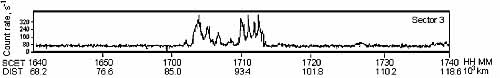 Caption Above: Energetic particle signature recorded by the EPONA instrument on board Giotto in the energy range ~ 60-100 keV. The data are believed to represent the signature of a companion to Comet Grigg-Skjellerup. Particle count rate is shown on the vertical axis. Time and distance from the comet are shown on the bottom scale. (Courtesy Susan McKenna-Lawlor) This is the first time that the discovery of a comet using energetic particle data has been claimed. Splitting of cometary nuclei is a well known phenomenon that can occur even at large distances from the Sun. In the case of Grigg-Skjellerup, evidence for small-scale fragmentation of the nucleus was also identified from Giotto's Optical Probe Experiment (OPE). The Optical Probe detected a number of striking 'spike' features or 'events' during the Grigg-Skjellerup flyby. While scattering of sunlight caused by dust impacts on the spacecraft body may account for some of these, the complex data profiles can also be explained by activity from dust jets in the comet's inner-most coma. One particular event occurring at least 1000 km from the comet may have been caused by the presence of a small nucleus fragment. The evidence indicates that a chunk, 10-100 m in radius, had broken away from the comet and passed around 50 km from the spacecraft. Despite its small size, it seemed to be producing a small dust coma of its own. Unfortunately, the particular event detected by EPONA was not seen in the OPE data. (ref. McBride, N., S.F. Green, A.C. Levasseur-Regourd, B. Goidet-Devel and J.-B. Renard, The inner dust coma of comet 26P/Grigg-Skjllerup: multiple jets and nucleus fragments? MNRAS 289, 535--553, 1997.)