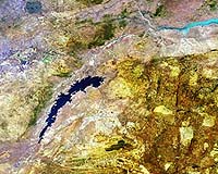 The 20th century was the great age of dam building, which did more than any other single human activity to change the face of our planet. Lake Kariba was created in the late 1950s by the construction of a largest dam wall across the Zambezi River running through the Kariba Gorge. More than a million cubic metres of concrete were employed to build the 24-metre thick and 36.6-metre high wall, which was designed to sustain the pressure of nearly ten million litres of water passing through its spillway every second. It is located at the northernmost shore of Lake Kariba. Jointly owned by the governments of Zambia and Zimbabwe, the dam was constructed to supply hydroelectric power to the then-British colonies, but today is also significant for fishing and recreational uses. Maximum water level was reached in 1963, some 700 animals being saved from floodwaters by a rescue operation called Operation Noah. Today Lake Kariba is one of the largest dams in the world, with a surface area of 5580 square kilometres and an average depth of 29 metres, increasing to a maximum of 97 metres. It is 220 km long and in places up to 40 kilometres wide. Its waters support more than 40 different species of fish � including the sardine-like kapenta, a protein-rich fish around which a local fishing industry has developed. In a rare example of a successful introduction of a non-native species to a lake, the kapenta - taken from Lake Tanganyika - has apparently had a minimal biological impact. Also present are hippo and crocodile, with elephant, buffalo, rhino and smaller animals abundant in the surrounding valley. North of the eastern side of Lake Kariba is the Zambian capital of Lusaka, visible as a whitish area. Northwest of Lusaka is a noticeable square-marked grey feature which is the Lukanga Swamps, an ecologically important wetland region. Over on the Zimbabwean shoreline is located Matusadona National Park � a notable safari park and home to endangered Black Rhinos - while above it in the Chizarira Hills is found the remote Chizarira National Park. Follow the Zambesi River east to find another narrow lake, apparently shallower from its light-blue colour: this is Mozambique's 270-km-long Lago de Cahora Bassa (Cahora Basin Reservoir), which was dammed in the 1970s. The Medium Resolution Imaging Spectrometer (MERIS) acquired this image on 6 June 2005, operating in Full Resolution mode with a spatial resolution of 300 metres. It covers an area of 672 by 672 kilometres. Related LinksTerraDaily Search TerraDaily Subscribe To TerraDaily Express ![]() ![]() This Proba image shows the region around Samoylov Island, located within the Lena River Delta on the Laptev Sea coast of Northern Siberia.