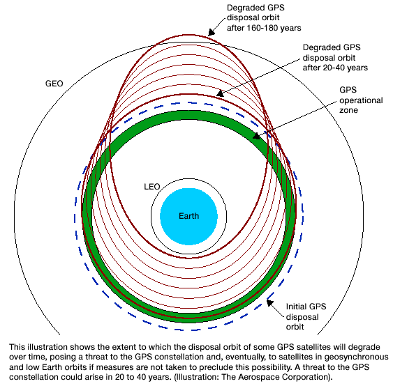 By following revised procedures in disposing of decommissioned GPS satellites the possibility of collisions between these and operating satellites can be greatly reduced, researchers at The Aerospace Corporation have concluded. In studies for the Air Force, researcher Dr. Chia-Chun (George) Chao discovered that GPS satellites placed in disposal orbits can eventually, perhaps in 20 to 40 years, encroach into the operating constellation. This is because the disposal orbits, while circular initially, degenerate into orbits with significant eccentricity, or ovularity, mostly as the result of sun-moon gravitational perturbations. Besides intersecting the GPS constellation, these satellites eventually could pose a threat to operational satellites in low Earth and geosynchronous orbits, Dr. Chao said. The GPS constellation, comprising 28 satellites, operates at medium Earth orbit, about 11,000 miles above Earth. The solution, Aerospace studies show, is to