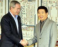 US President George W. Bush and his South Korean counterpart Roh Moo-Hyun said Thursday they were committed to eventual peace and reunification on the Korean peninsula. North and South Korea have been technically at war ever since the 1950-1953 Korean War and have yet to replace the armistice that ended the conflict with a proper peace treaty. "The two leaders agreed that reducing the military threat on the Korean Peninsula and moving from the current armistice mechanism to a peace mechanism would contribute to full reconciliation and peaceful reunification on the Korean Peninsula," said a joint statement from Bush and Roh after their summit here. Calls for a formal peace treaty have been made before by both North and South Korea. Bush and Roh said Thursday that eventual treaty talks should take place "in a forum separate from the six-party (nuclear) talks". Their joint statement was issued after the two leaders met ahead of the Asia-Pacific Economic Cooperation (APEC) summit in the South Korean port city of Busan. Ahead of the fourth round of six-party talks which began in July, North Korea suggested that Washington and Pyongyang should replace the armistice with a peace mechanism. A peace mechanism on the Korean peninsula would lead to an end to hostility between the two sides, which would in turn "automatically result in the denuclearization of the peninsula," it said. All rights reserved. � 2005 Agence France-Presse. Sections of the information displayed on this page (dispatches, photographs, logos) are protected by intellectual property rights owned by Agence France-Presse. As a consequence, you may not copy, reproduce, modify, transmit, publish, display or in any way commercially exploit any of the content of this section without the prior written consent of Agence France-Presse. Related Links TerraDaily Search TerraDaily Subscribe To TerraDaily Express
