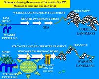 Who would have thought that melting snow cover in the Himalayan Mountains could alter the ocean food chain over a thousand miles away? Well, that's just what's happening, according to a NASA-funded study appearing in this week's Science magazine. The study finds a decline in winter and spring snow cover over Southwest Asia and the Himalayan mountain range is creating the right conditions for more widespread blooms of ocean plants in the Arabian Sea. The decrease in snow cover has led to greater differences in both temperature and pressure systems between the Indian subcontinent and the Arabian Sea. The pressure differences generate monsoon winds that mix the ocean water in the Western Arabian Sea. This mixing leads to better growing conditions for tiny, free-floating ocean plants called phytoplankton. Phytoplankton serve as the base of the ocean food chain. Joaquim Goes, a senior researcher at the Bigelow Laboratory for Ocean Sciences in Maine is the study's lead author. He and colleagues used data from OrbImage and NASA's Sea-viewing Wide Field-of-view Sensor (SeaWiFS) satellite to show that phytoplankton concentrations in the Western Arabian Sea have increased by over 350 percent over the past 7 years. "Climate change and warming are causing a decline in snow cover over the Eurasian region, especially over the Himalayas," said Goes. "The associated shifts in winds, and increased phytoplankton levels in the Arabian Sea, could have far reaching consequences for the ecosystem of the region." When winter and spring snow cover is low over Eurasia, more of the Sun's rays are absorbed by Earth, rather than getting reflected back out to space. As a result the land mass heats up more in summer creating a larger temperature difference between the water of the Arabian Sea and the Indian subcontinent landmass. The temperature shift is responsible for a difference in pressure over land and the sea, creating a low pressure system over the Indian subcontinent and a high pressure system over the Arabian Sea. This difference in pressure causes the winds to blow from the Southwest Arabian Sea bringing rainfall to the subcontinent from June to September each year, known as the summer monsoon. In the Western Arabian Sea these winds also cause upwelling of cooler nutrient-rich water, creating ideal conditions for phytoplankton to bloom every year during summer. Since 1997, a reduction in snow has led to wider temperature differences between the land and ocean during summer. As a consequence, sea surface winds over the Arabian Sea have strengthened leading to more intense upwelling and more widespread blooms of phytoplankton along the coasts of Somalia, Yemen and Oman. According to Goes, while large blooms of phytoplankton can enhance fisheries, exceptionally large blooms could be detrimental to the ecosystem. Increases in phytoplankton amounts can lead to oxygen depletion in the water column and eventually to a decline in fish populations. Related Links Climate Change at Bigelow Laboratory for Ocean Sciences TerraDaily Search TerraDaily Subscribe To TerraDaily Express ![]() ![]() If increased precipitation and sea surface heating from global warming disrupts the Atlantic Conveyer current � as some scientists predict � the effect on the ocean food chain in the Atlantic and other oceans could be severe, according to a new study just published in Nature.