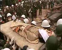 Beijing (AFP) May 29, 2008 Forty half-starved earthquake survivors have been rescued from a remote area in southwestern China a full 16 days after the disaster, state press reported on Thursday. They were flown out by helicopter on Wednesday from the quake-shattered village of Yangjiagou in Sichuan province, the West China Metropolitan Daily said. The survivors had been prevented from escaping by landslides triggered by the 8.0-magnitude earthquake on May 12, which had blocked roads in the rugged region, it said. The village is 20 kilometres (12 miles) from the nearest town. The survivors, who included local villagers and a group of mining company workers, were flown to a nearby temporary camp for earthquake survivors. The earthquake has claimed 68,109 lives with another 19,851 people missing, a government spokesman said on Wednesday. Community Email This Article Comment On This Article Share This Article With Planet Earth