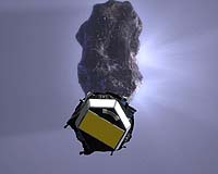 Boston MA DC (SPX) Jun 17, 2005 The Submillimeter Array (SMA) will be ready and watching when NASA's Deep Impact probe strikes the nucleus of Comet Tempel 1 on July 4th. The impact is expected to excavate material from the comet's interior-material left over from the earliest days of our solar system. "The SMA will be the only operational millimeter or submillimeter array observing Tempel 1 at the time of the impact" said astronomer Charlie Qi of the Harvard-Smithsonian Center for Astrophysics (CfA). "As such, there's no telling what we may see!" A few observatories can study comets in the same wavelength regime as the SMA, but none match SMA's exquisite resolution. "The SMA will be the only submillimeter telescope in the world to make an image of the molecules released by the impact," said astronomer Glen Petitpas (CfA). By observing submillimeter radiation, the SMA can "fingerprint" comets and determine their molecular composition. "SMA will observe mostly cool gas and dust with relative chemical abundances that may or may not be typical of other comets. We hope to see something NOT typical, because that would be most exciting to us scientifically," said Qi. In the 1950s, the late Dr. Fred Whipple (CfA) developed the famous "dirty snowball" model for comets. Whipple hypothesized that comets consisted of ice with some dirt and rock mixed in. Modern astronomers believe that comets are better described as "icy dirtballs," containing more dirt and less ice than previously thought. Deep Impact's mission is to test these new models by excavating a crater more than 80 feet deep and 300 feet in diameter, revealing the comet's pristine interior. Scientists will compare the freshly excavated material to the more easily visible cometary surface. Ernst Tempel discovered Comet Tempel 1 in 1867. The comet has made many passages through the inner solar system orbiting the Sun every 5.5 years. This makes Tempel 1 a good target to study evolutionary change in the mantle, or upper crust, of the comet. While the impending SMA observations of Deep Impact were a hot topic of discussion at this week's meeting on submillimeter astronomy held in Cambridge, Mass., Comet Tempel 1 is only one of the solar system objects that the SMA has studied.