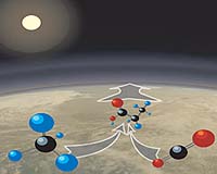 Moffett Field CA (SPX) Feb 20, 2007 Saturn's giant moon Titan is enveloped by a thick layer of organic haze. Although Titan's haze layer is unique in the present-day solar system, a recent experiment by researchers at the University of Colorado at Boulder suggests that, billions of years ago, Earth was also covered by organic haze. The finding not only sheds light on our planet's early atmosphere, but could also help explain how life spread around the globe. Titan's haze is the result of methane in the moon's atmosphere. Hundreds of miles above its surface, ultraviolet sunlight bombards methane gas molecules with high-energy photons, breaking them apart. This destructive process, known as photolysis, leaves behind free hydrogen and small hydrocarbon fragments (CH2). The fragments are like building blocks: they can combine with each other to form larger, chain-like molecules, such as ethane, propane and acetylene. Methane in Titan's atmosphere is a transparent gas, but the larger molecules condense into aerosol particles, which form the haze. Computer modeling studies by Alex Pavlov, currently a professor of planetary science at the University of Arizona at Tucson, predicted that if early Earth also produced methane, then perhaps it too was covered in haze. But early Earth's atmosphere also had a component that Titan's atmosphere lacks: carbon dioxide (CO2). Margaret Tolbert, a professor of chemistry at the University of Colorado in Boulder, and her graduate student Melissa Trainer set up a lab experiment to test Pavlov's model, to see if they could produce haze in an "atmosphere" simulating early Earth's. Initially, they were skeptical. We thought "you would get these oxygen atoms coming off of the CO2," which would react with the CH2 fragments from the methane and prevent longer hydrocarbon chains from forming, says Trainer. "And so you wouldn't get big enough molecules to condense into particles." No particles, no haze. But "that's not what we found," says Tolbert. "Quite the contrary." Their initial experiment replicated what takes place in Titan's atmosphere. They put methane gas in a sealed container (along with nitrogen, a major component of Titan's atmosphere, as it was of early Earth's), and irradiated the contents with very-short-wavelength, high-energy UV radiation. The researchers chose a radiation source that included a wavelength of 121 nm, which is powerful enough to crack apart methane molecules. "The sun's spectrum has a peak emission right at that wavelength," Tolbert explains. Under these conditions, a haze did form, just as it does on Titan. They used a novel instrument known as an aerosol mass spectrometer (AMS) to catalogue the microscopic haze particles. Using the AMS allowed them to obtain results for particles "on the fly." Past experiments had to be run for hours, days, or even weeks, long enough for the particles to form a coating on the inside of the container, which was then scraped off and analyzed. But the AMS let Trainer and Tolbert assess the aerosol particles while they were still airborne in the container. "If we turn on our UV lamp, and there are gases flowing, within minutes we can get an aerosol mass spectrum telling us what the particles are made of," Tolbert says. Then they ran the experiment again, adding increasing ratio of CO2 to the methane, to simulate early Earth. And they still got haze. In fact, says Tolbert, "when you have CO2 and methane in roughly equal amounts, you actually get even more haze than if you just had methane alone." As they increased the amount of CO2 further, the haze formation tapered off, "but we always saw some level of haze produced," Tolbert says. They're still trying to understand what happened. "We can't fully explain it," Tolbert admits. But they have a hypothesis. When only methane is present, some of the hydrogen atoms that get split off from methane recombine with the CH2 fragments to reform methane. That limits the number of CH2 fragments available to bind together into longer-chain molecules. But when carbon dioxide is also present, it is split into carbon monoxide and oxygen atoms. The researchers suspect that this oxygen combines with hydrogen from the methane to make water. That leaves less hydrogen available to re-attach to the CH2 molecules, so more of the CH2 molecules bond to each other. The result: more long-chain molecules, and more haze. If they're right, their findings could have important implications for the spread of life on Earth. When life first emerged, it most likely was restricted to isolated enclaves, because it was dependent on nutrients that were highly localized. But some of these early organisms were methanogens, which were belching out methane that eventually drifted up to the upper atmosphere. There this methane, along with CO2, was bombarded by high-energy UV radiation from the sun. Long hydrocarbon chains started to form, and the longer the chains got, the more readily they condensed into aerosol particles. Eventually, the Earth was covered by a haze of these particles, which rained down onto the surface. In this process, CO2 was important for a second reason. Although much of the oxygen liberated from the carbon dioxide combined with hydrogen to form water - that's the process that let the haze form - some of it attached to the growing hydrocarbon chains. Oxygenated hydrocarbon chains are an energy-rich food source, and when these molecules began to rain down onto Earth, that food source became available planet-wide. "Life could be sustained in every little puddle on Earth," says Tolbert. If they're right. Being right, however, requires that the atmosphere of early Earth was not brimming with oxygen, as it is today. Most researchers believe that the rise of oxygen in Earth's atmosphere didn't come until some 2 billion years after the origin of life. But if early Earth had an oxygen-rich atmosphere, haze formation could not have taken place. On the other hand, it's possible that some