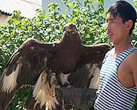 Issyk-Koul Region, Kyrgyzstan (AFP) Sep 07, 2005 Perched on his trainer's arm, Duman, a great golden eagle with a two-meter wing span, patiently awaits the chance to launch into flight over Kyrgyzstan's Issyk-Koul lake and seize his prey before admiring eyes of falconry fans. The hares are set loose, and the trainer takes off the leather cap that until now blinded the bird -- which instantly homes in on the fleeing animals. At a signal, Duman rockets into the sky, makes a small reconnaissance circle and then plunges down onto one of the sacrificed hares, seizing it by the throat and pinning it to the ground. Dozens of tourists from as far as the United States and Japan travel in late August to this picturesque region of eastern Kyrgyzstan to take part in the festival dedicated to birds of prey -- especially the golden eagle, whose training is highly prized in this part of the country. Ishenbai Kydyrov, Duman's owner, is one of an old family of golden eagle trainers which has lived on the banks of Issyk-Koul for centuries. Himself a businessman, he pursues the family tradition in his spare time. "Sometimes it seemed to me that my father could speak the eagles' language, so deeply they understood each other," Kydyrov recalled. "My father taught me that the most important thing in taming the eagle is to be as gentle as possible with it, as if dealing with a baby. Later, when the bird gets used to you, it becomes very close, like a brother." Kydyrov has dozens of apprentices to confide his falconry secrets to. "One must search out birds to train directly in the nest, or catch them later with a net. The true raptors have strong talons and powerful wings," he explained. "The trainer must place a cap on the eagle's head and keep it perched on his arm for hours without the bird falling asleep. This way it gets used to its future master," the Kyrgyz expert said. Then the trainers teach the bird to eat from their hands. An average raptor eats about a kilogram of raw meat a day. The training takes nearly a month. "One must not, for any reason, cry or frighten the bird. An eagle never forgets a slight and can fly away and never come back," Kydyrov warned. Duman, who weighs nearly 10 kilograms (22 pounds), is capable of snaring an animal weighing up to 15 kilograms (33 pounds) -- at the beginning of the hunting season he had seized six foxes. The golden eagle is Kyrgyzstan's official emblem, and the small mountainous republic's people treat it with a particular reverence. "For the Kyrgyz, it is a sacred bird which brings good fortune," said Talbat Shaibyrov, a young trainer also present at the festival. By his side, 58-year-old Asset Radjanov proudly recalled how his grandfather's bird saved his village's inhabitants from starvation during the second World War. "It was a powerful bird, capable of lifting a mouflon (wild sheep) three meters above ground. It would drop its prey from that height and my grandfather had only to pick it up. Thanks to its hunt, my people managed to survive," Radjanov said. In the wild, eagles can live up to 100 years, while in captivity their life expectancy rarely tops 45 years -- which is why Kyrgyz trainers generally give them back their freedom after a decade of loyal service. Related Links SpaceDaily Search SpaceDaily Subscribe To SpaceDaily Express