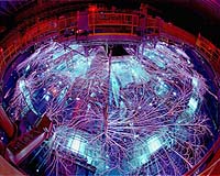 Albuquerque NM (SPX) Oct 22, 2004 Sandia National Laboratories' Z machine, which last year emitted neutrons to enter the race to provide the world virtually unlimited electricity from, essentially, seawater, has received approval from the National Nuclear Security Administration (NNSA) to proceed with a $61.7 million refurbishment. The project is called ZR, for Z-Refurbishment. The machine's immediate purpose is to provide data to feed into supercomputers that simulate nuclear weapon explosions and to test materials under extreme conditions. "The advance will support the weapons program and materials work not only at Sandia but at Livermore and Los Alamos national laboratories," says Sandia Senior VP Tom Hunter, who managed the funding that made the new installation possible. "This significant upgrade and investment also will allow us to move to a new level of insight of z-pinches and their relationship to fusion. I give credit to the Sandia project team and NNSA for making this a reality." Eight years ago, the Z machine startled the world when a technical advance enabled the machine's power output to rise the way investors want their stock graphs to move: nearly straight up. Output for Sandia's pulsed power projects, which had increased only slowly for more than a decade, rose dramatically. For Z, just coming on line, an expected usable output of 50 terawatts rose over the next two years to 230 terawatts. This made the machine not only more valuable as a data provider for nuclear weapons simulations but also showed that z-pinches were a possible candidate for peacetime fusion. Articles noting the advance appeared in newspapers ranging from the New York Times to USA Today, and from Esquire Magazine to Scientific American. The dramatic photo of Z firing became the most widely published picture in Sandia's history, appearing (among myriad newspapers, magazines, TVs, and textbooks) as the centerfold of a National Geographic issue celebrating "Machines of the Future" and even in a recent issue of the "men's" magazine Maxim. Last year, Z researchers announced that Z had generated neutrons by imploding a small capsule filled with deuterium. This emission signaled that the machine not only theoretically but in fact had joined a select group of machines capable of executing high-quality fusion implosion experiments. The coming upgrade can only increase thermonuclear neutron emission, say Z researchers. Z's overall form will be unchanged, but its working numbers will be significantly different. Instead of 18 million baseline amps bathing the target, 26 million amps will make the journey. The X-ray usable peak emissions will rise from 230 to 350 terawatts (more than 100 times the entire world's output of electricity for a few nanoseconds.) The [x-ray] energy output will rise from 1.6 to 2.7 megajoules. In the next two years, 36 new Marx generators (large capacitors) will be installed. Exactly the size of their 20-year-old predecessors, the devices' newer technology will store twice the energy as the original installation. Thirty-six very rapid switches, formerly bathed in water and operated en masse by a single signal, will be upgraded to a system - oil-bathed for greater insulation - that alerts each switch individually when to turn on. Each switch controls the electrical current proceeding down 36 transmission lines, each as big around as a horse's midriff, thus enabling researchers to shape the machine's electrical pulse. The trigger upgrade and expected improvement in pulse shaping should make the already-overbooked machine even more valuable to researchers from Sandia, LANL, and LLNL whose calculations depend on shape-controlled electrical current flows and X-ray outputs. Jeff Quintenz, director of Pulsed Power Sciences Center, looks forward to the increase in the facility's precision. "Now we're able to produce only the same pulse shape each time, when operating with a particular experimental configuration," he says. "Without this investment, experimentalists got what we had. Now we can dial a pulse; we have 36 switches that can be timed separately instead of 36 under one control." The machine also is expected to be lower-maintenance, with less downtime between shots. Current capacity is 200 shots/year, Quintenz says. The refurbished machine will be capable of 400 shots/year, assuming operational funding is available. Finally, in terms of capability, Quintenz says, "Z was originally optimized to produce a 50-nanosecond short pulse, with high voltage to accelerate [lithium] ion beams. When we converted to Z, we had to live with a machine designed to drive ion beams. The refurbishment is optimized for high current to suit a z-pinch, not high voltage to drive ions." "This is a pretty significant engineering-and-logistics tailoring job," says Ed Weinbrecht manager of the ZR project. "We have about a year and a half to complete the design and fabricate the parts we need." Plans then are to dismantle the existing accelerator, move the oil-water separation wall to accommodate the insulation needs of the very fast switches, and install all-new pulse power systems "in what will be a hectic six-month period," says Weinbrecht. The overall Z architecture, looked at from the roof, resembles a wagon wheel. Marx generators form the outer rim of the wheel, power transmission lines imitate spokes, and a central vacuum chamber holding the target functions as a kind of axle. Z-pinches employ high amperages to vaporize tungsten wires thinner than human hairs, creating particles imploding at a million miles an hour (500km/s). These, when colliding, give up their energy in the form of X-rays. Researchers also use the intense magnetic field created by the current either to accelerate particles outward or test the strength of materials. A less obvious but no less important reason for the new upgrade, says Jeff, is "to exercise our pulsed-power engineering capability so we don't lose it." The last big pulsed-power e